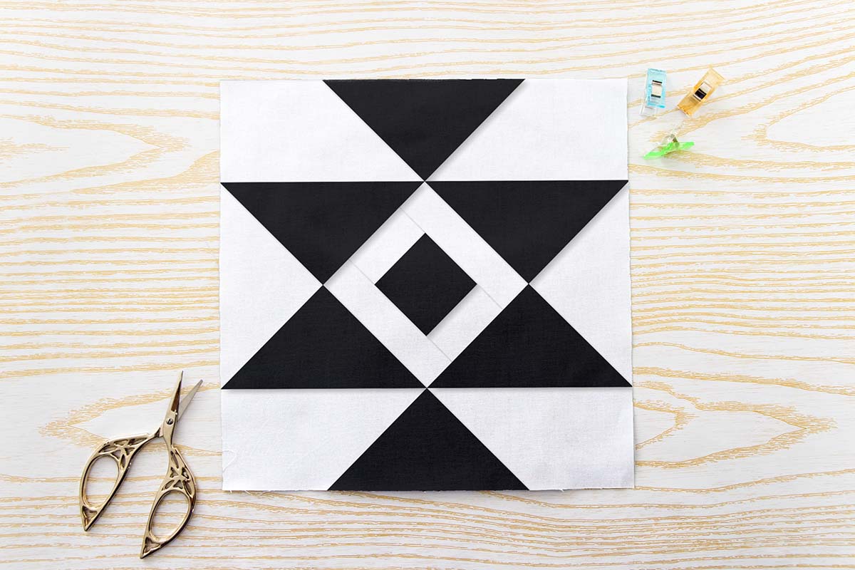 This stunning Aztec Bowtie Quilt Block Pattern takes the much loved hourglass quilt block to a whole new level with a bold dramatic horizontal band and a gorgeous white framed diamond sitting right at the heart of the design. The sharp high contrast black and white shapes create incredible visual tension — making it one of the most powerful and eye-catching blocks in the entire Aztec collection.